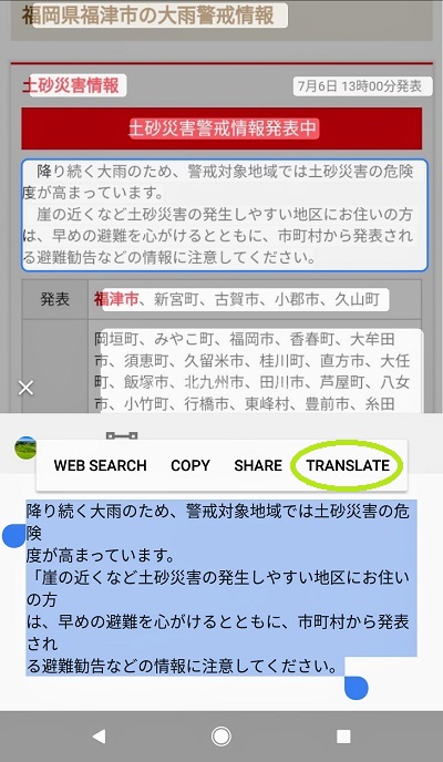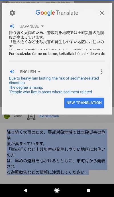When the Emergency Warning was issued in the morning, my Google Pixel 2 bought in India sounded a high-tone buzzer released by Yahoo! disaster alert app. However, the pop-up alert and the subsequent page after clicking it were all written in Japanese. When most of the interfaces of Japanese apps automatically detect the language setting of my Google Pixel (English,) why does the Yahoo! Disaster Alert (防災速報) app, which is playing a vital role in people's daily lives here in Japan, seem to be only in Japanese? I feel it's bizarre.