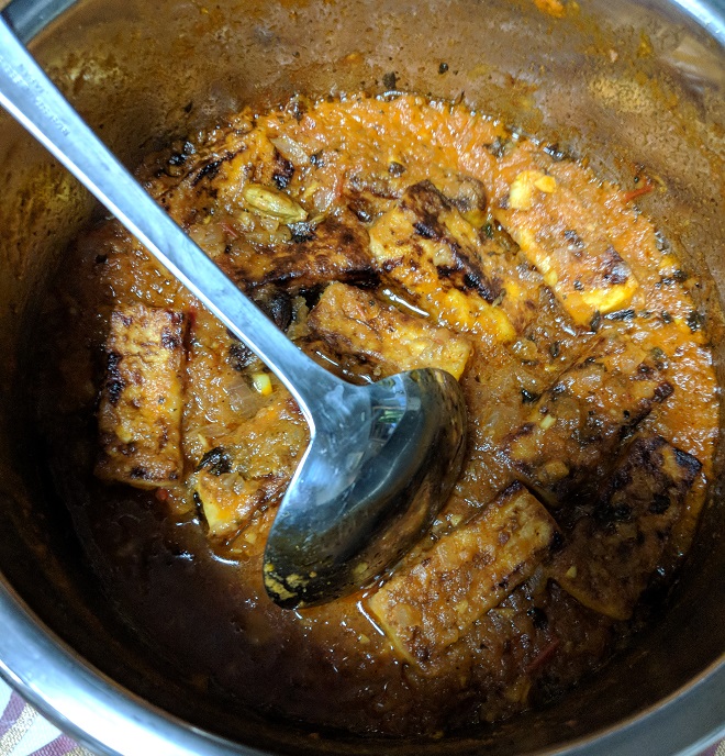 本日は、母の作ってくれた「豆腐ステーキ」を賞味したシッダールタのインスピレーションにより誕生した、パニール・マッカニー(पनीर मखनी、バターベースのソースにパニールを具として加えたリッチな北インド料理)ならぬ「豆腐マッカニー(तोफू मखनी)」のレシピを紹介したい。