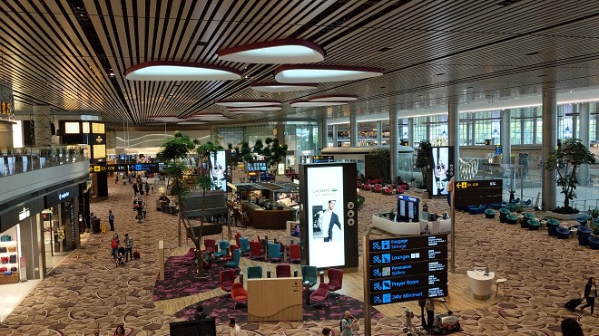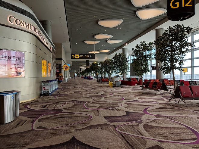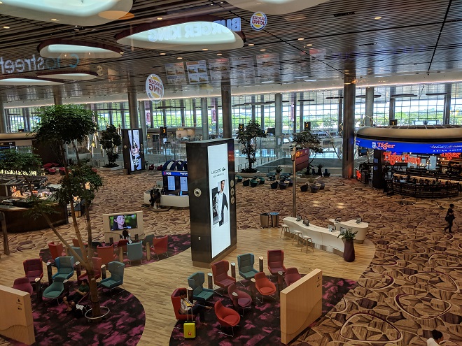 写真はチャンギ空港T4ターミナル出国後エリアです。奥の方にはゲイランのショップハウスを彷彿とさせる街並みが再現されたエリアもあります。