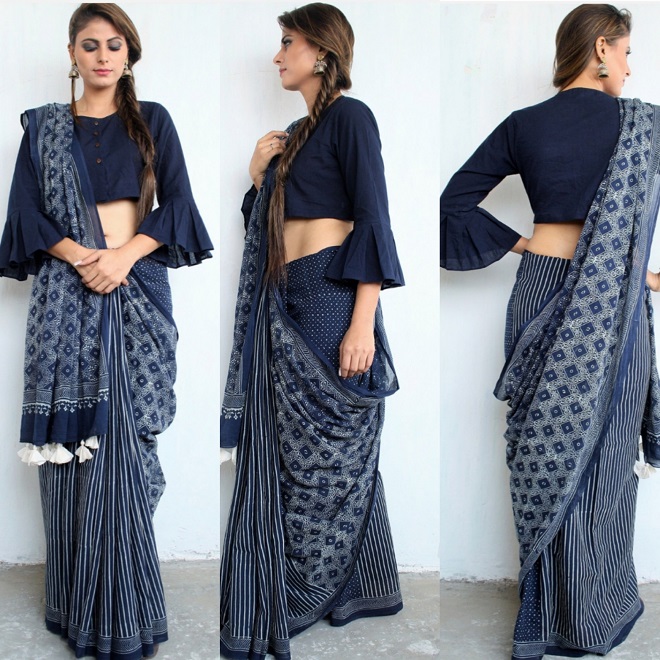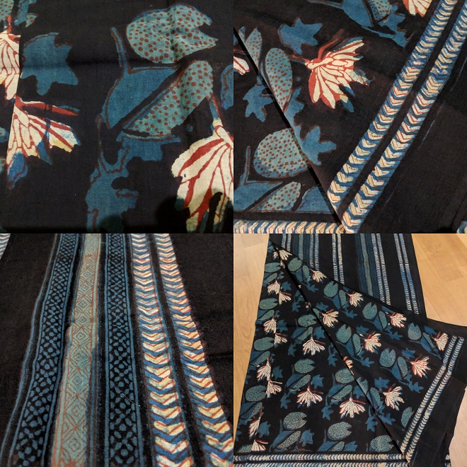 黒地のサリーにはボディ部分に蓮の花と根、そして蓮の葉を、そしてパッルー部分には雨を思わせるゆらぎボーダーをブロックプリントした、熱帯の空気の中に立ち上る雨の匂いと、豊かに揺れる水辺を表現したようなサリーで、とても気に入っている。