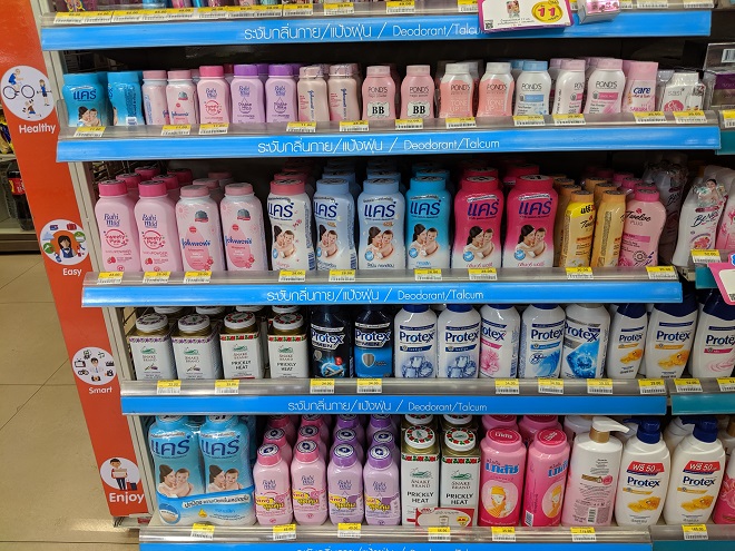 先日たまたまタイに立ち寄った際、タルカムパウダーを求めてコンビニエンスストアを覗いてみたところ、こちらでも外資系からタイ系まで、いろいろな会社が実にいろいろな種類の商品を出しており、大きめ店舗の陳列棚の、ほぼ半分をタルカムパウダーが埋め、おまけにどんどん売れていくので品薄気味だった。