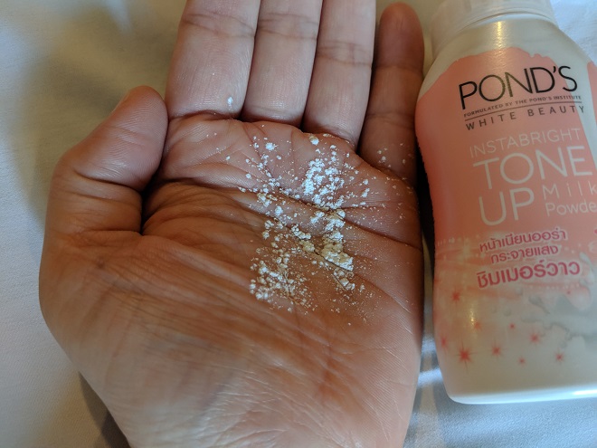 トーンアップの方は一般のタルカムパウダーと同じ白色の粉末だが、肌に延ばすと細かいラメがキラキラと光っているのが見える。