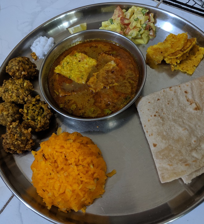 カレーのように見えるのはパタワリー(पातवडा)と呼ばれるマハーラーシュトラ州東部ヴィダルバー(Vidarbha)地方独特の料理。