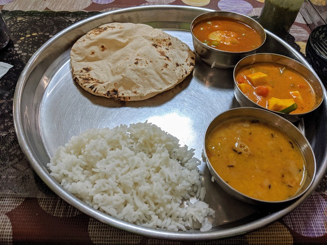 The pure vegetarian restaurant Kusum does not have a menu; it depends on the availability of that day except for nashta. That day we were served a glass of water, shredded cabbage salad, two samosa, aloo matar, paneer masala, plain dal, chapati (oh no, phulka!,) Indian rice, and chai. The price is jaw-dropping 1,000 yen and moreover, it's all you can eat style of unlimited serving place.