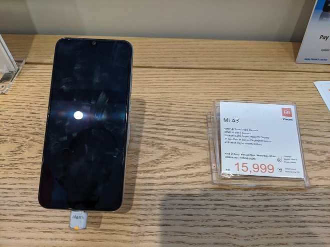 写真はシャオミA3、なかなかいいスペックで16,000ルピー未満という格安スマートフォンです。