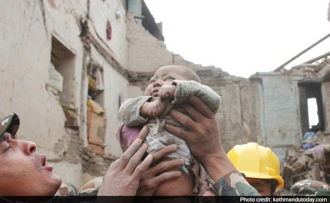 26日、マグニチュード7.9の大地震発生から22時間が経過したネパールの町バークタプール(Bhaktapur)で、崩壊した建物の瓦礫の中から生後4ヶ月の赤ちゃんが奇跡的に救出され、生存が確認された。