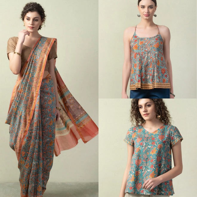 写真のサリーは今年の夏(インドの夏は3月ごろから)のはじめ、「FabIndia」が「Indian Spring」コレクションとしてショッピングサイトに展開した商品である。
