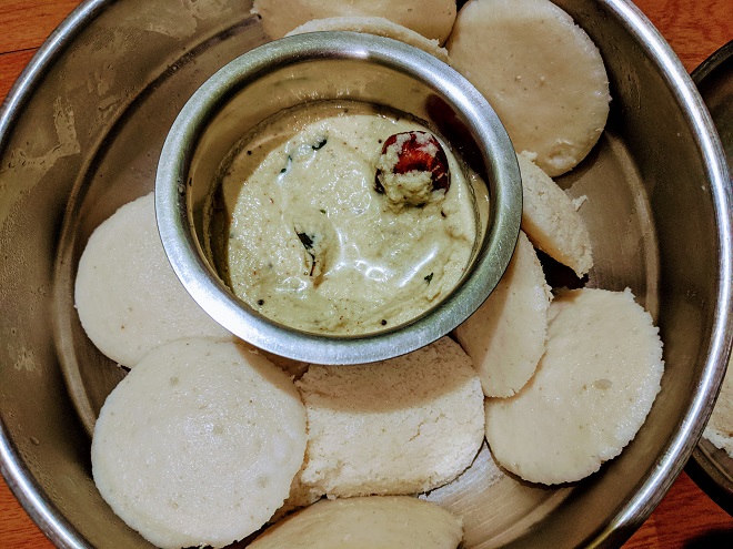 写真は近所に住む料理上手な夫の妹がロックダウン中に作って届けてくれた、イドリーとココナッツ・チャトニーです。