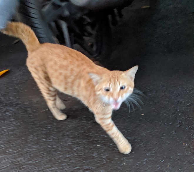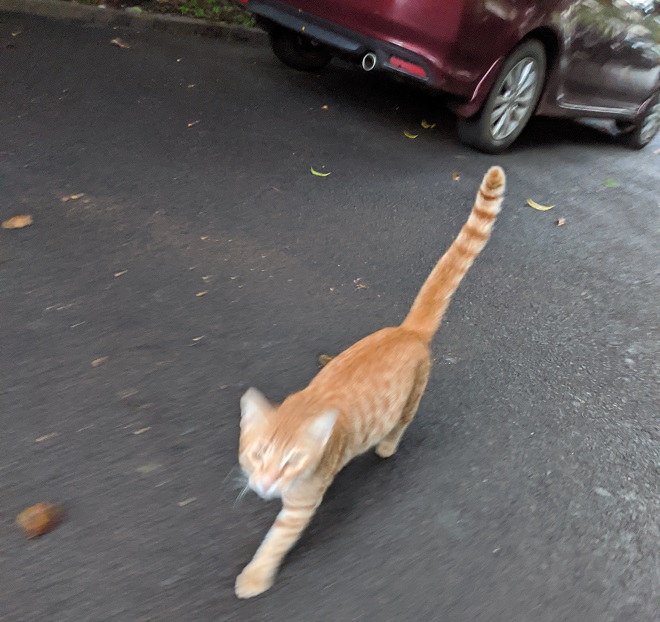 本日はプネー限定ロックダウン解除したての朝の街並みと、団地のコミュニティーキャット、わるおくんが、エサ欲しさに追いかけてくる画像のみお届けする。