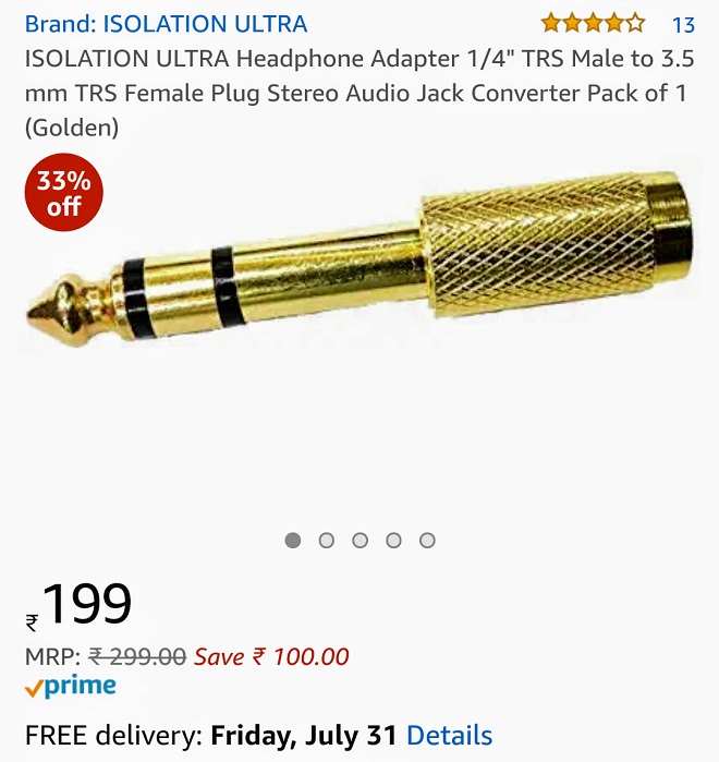 また、電子ピアノ用ヘッドフォンを福岡の実家に持ち帰ったままになっており、練習用のモノをこちらでも探さねばと兼ねてから思っていたため、1台のヘッドフォンをPCとピアノ両方で使うための、ピンの太さを3.5から6.35ミリに変換するアダプターも199ルピーで購入。