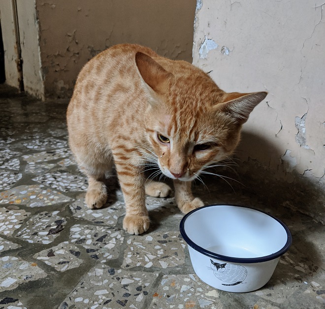 白いホーロー食器には、わるおくんと対面して、のんびり猫ちゃんが。