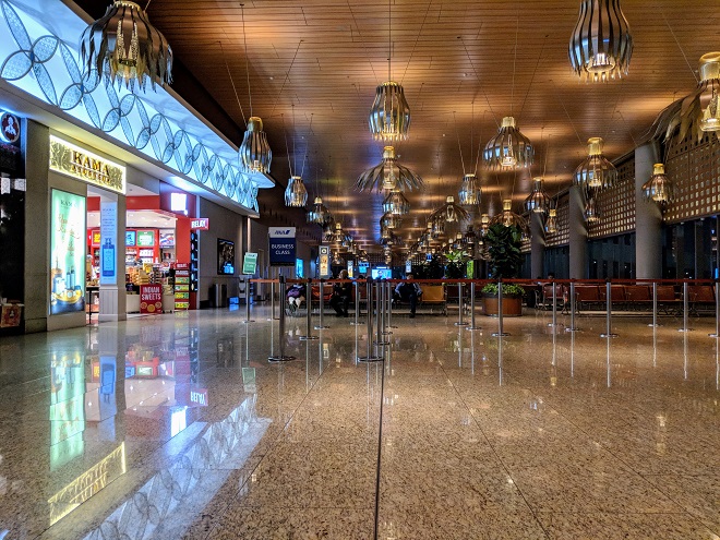 ターミナルビル内、出国手続きを終えたエリアでくつろぐ人々。