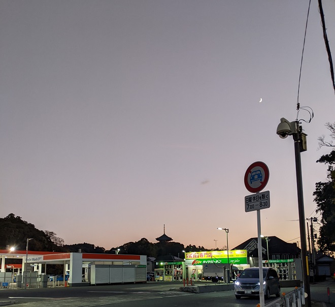 Naritasan Shinshoji's three-story pagoda and the crescent moon.
