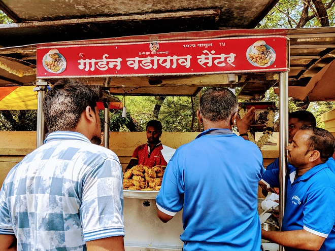 当時すでに店頭に出していたワダ(茹でたジャガイモを成形し、ベサンと呼ばれる豆粉の衣に浸けてから揚げた料理)をパオ(ポルトガル伝来とされるパン)に挟み、チャツネと素揚げのグリーンチリとともに売ることを思い付いた。