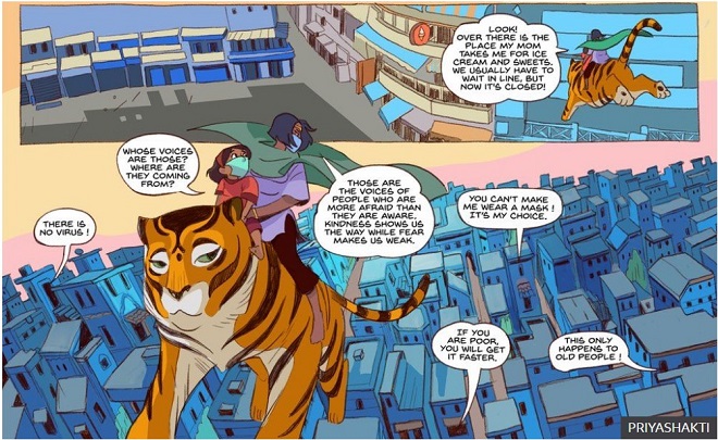 「プリヤのマスク」の中で、プリヤは空飛ぶメスのトラ、サハス(ヒンディー語で「勇気」)に乗り、「史上かつてないウイルスという、見えない怪物」と戦う。