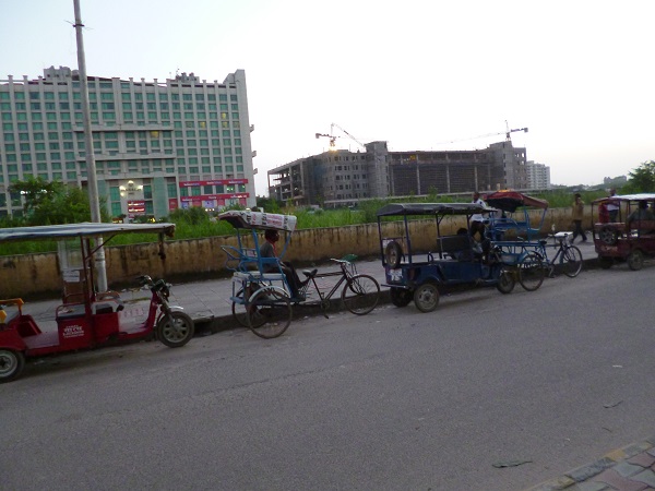 駅前で待機するサイクルリクシャーとオートリクシャー