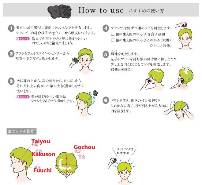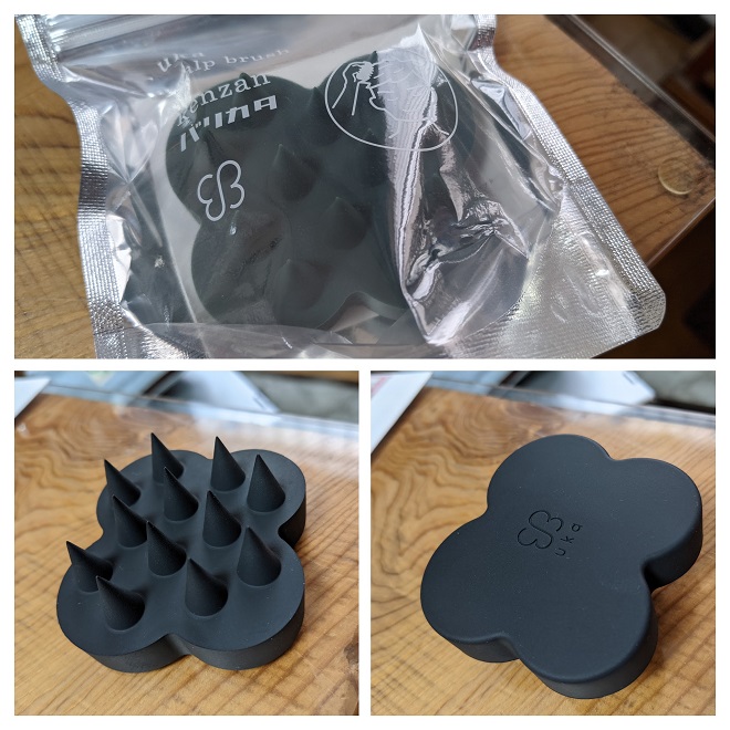 The brush is made of hard silicone and useful for pressuring acupoints also. The product lineups are four types of hardnesses; soft, medium, regular, and barikata [super hard]. I bought barikata, regular, and medium, and am using it alternatively for shampooing and refreshing while working on PC.
