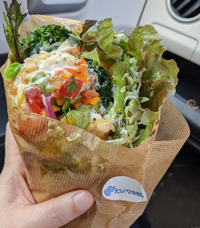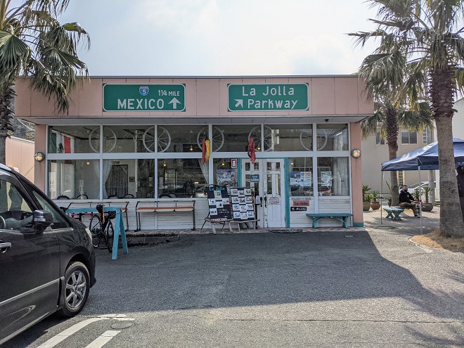 La Jolla, seemingly the only type of Mexican Tacos hut in the area, was filled with hungry customers, and as early as 1 PM when we arrived today to collect the food we pre-ordered on the phone, the staff lady already hung the sign of "all sold out." When I took a bite of their shrimp and guacamole tacos (550 yen), I realized why they were so popular!