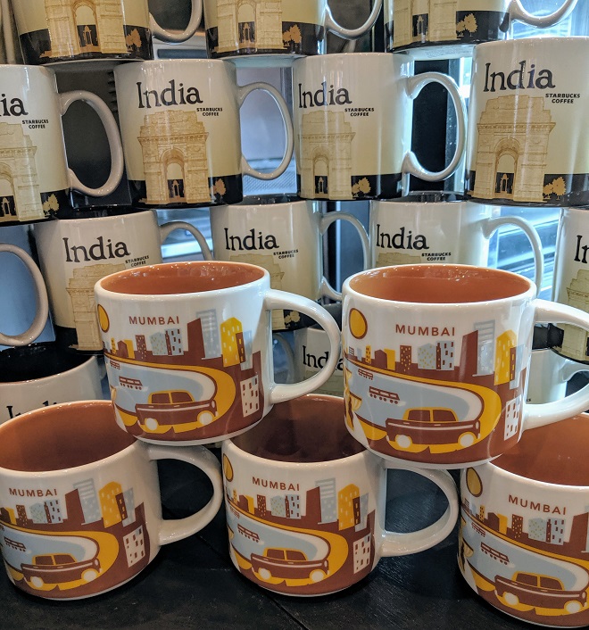 ムンバイーということで、写真はプネーのスタバで見かけた「Mumbai」マグです。いいよね。