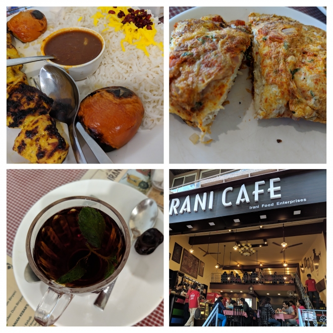 写真は近所のイラーニー・カフェに行くたびに注文する、わが家の定番メニューです。左上から時計回りにチキン・ビルヤーニー、マサラオムレツ、イラーニー・ティー(ブラックティーにミントの葉)。