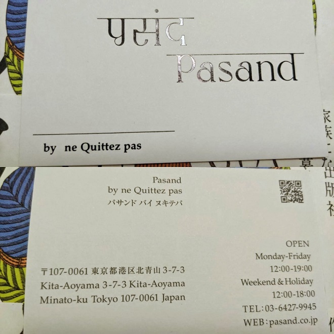 そこでわざわざ引き返してお店の方にお話を伺うと、「パサンド」とは「ヌキテパ」という会社がインド(主にデリーとその周辺)にて買い付けした品物を集めたセレクトショップで、表参道に常設店があるそう。