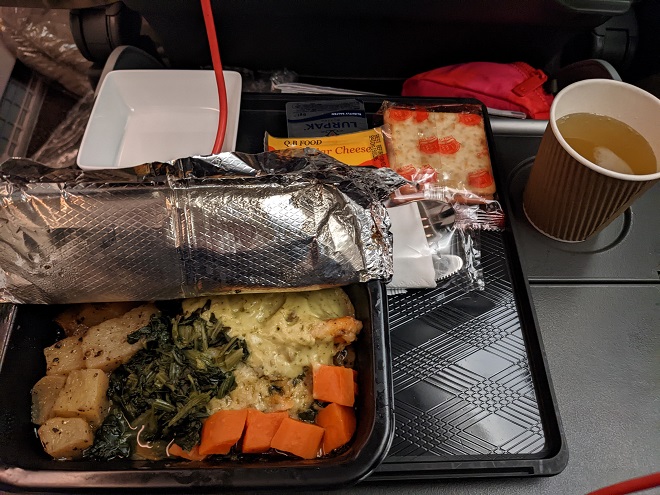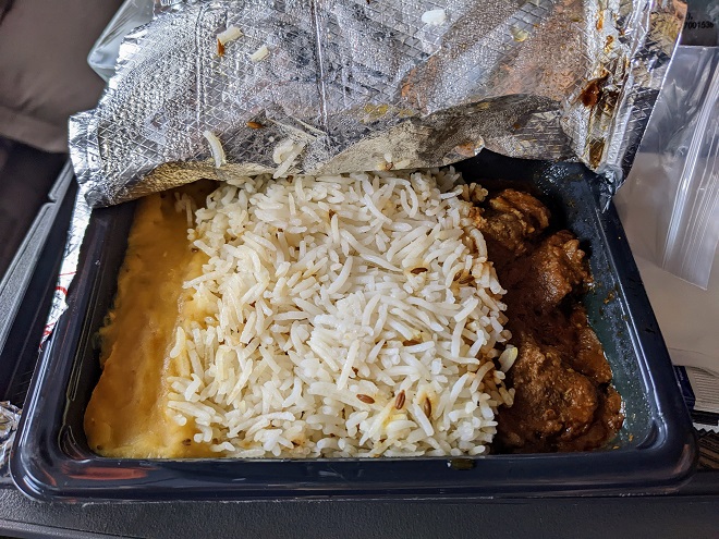 ムンバイーからのSQ421エコノミー機内食メインは、フォークで切れるほど柔らかく煮込まれた羊肉(Lamb)カレーとジーラライス、プレーンダル、羽田行きSQ636エコノミー機内食メインは、塩加減が絶妙な白身魚のムニエルと野菜のソテーだった。