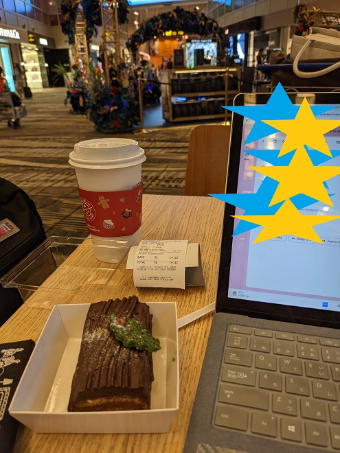 同ターミナルで、現地時間11日午後7時過ぎから同午後10時半ぐらいまでの3時間ほどを過ごす間、偶然にもシンガポール企業からのプロジェクト納品作業があったため、空港内のカフェ(The Coffee Bean and Tea Leaf)を利用したところ、コーヒー(ラージサイズのアメリカーノ)とお菓子を注文しただけで約15S$、当日のレートで1,600円にもなり息を吞んだ。