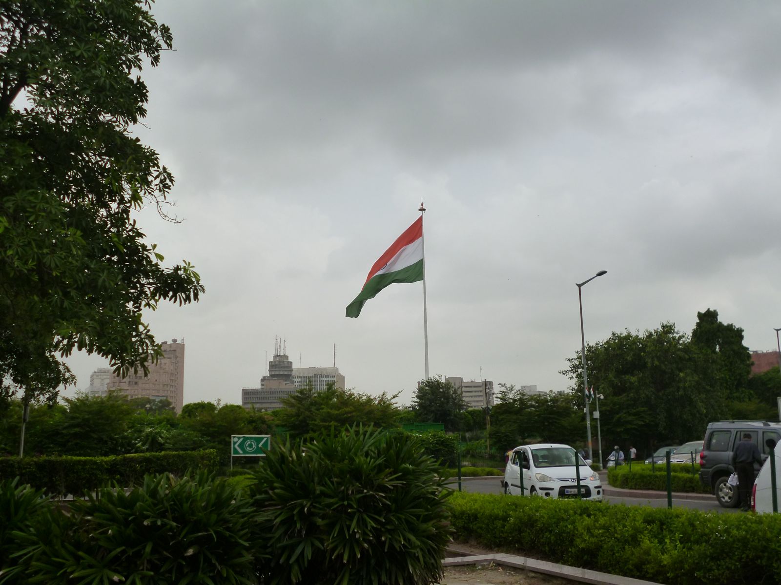 大きなインド国旗がはためく、コンノート・プレイス中央の広場。