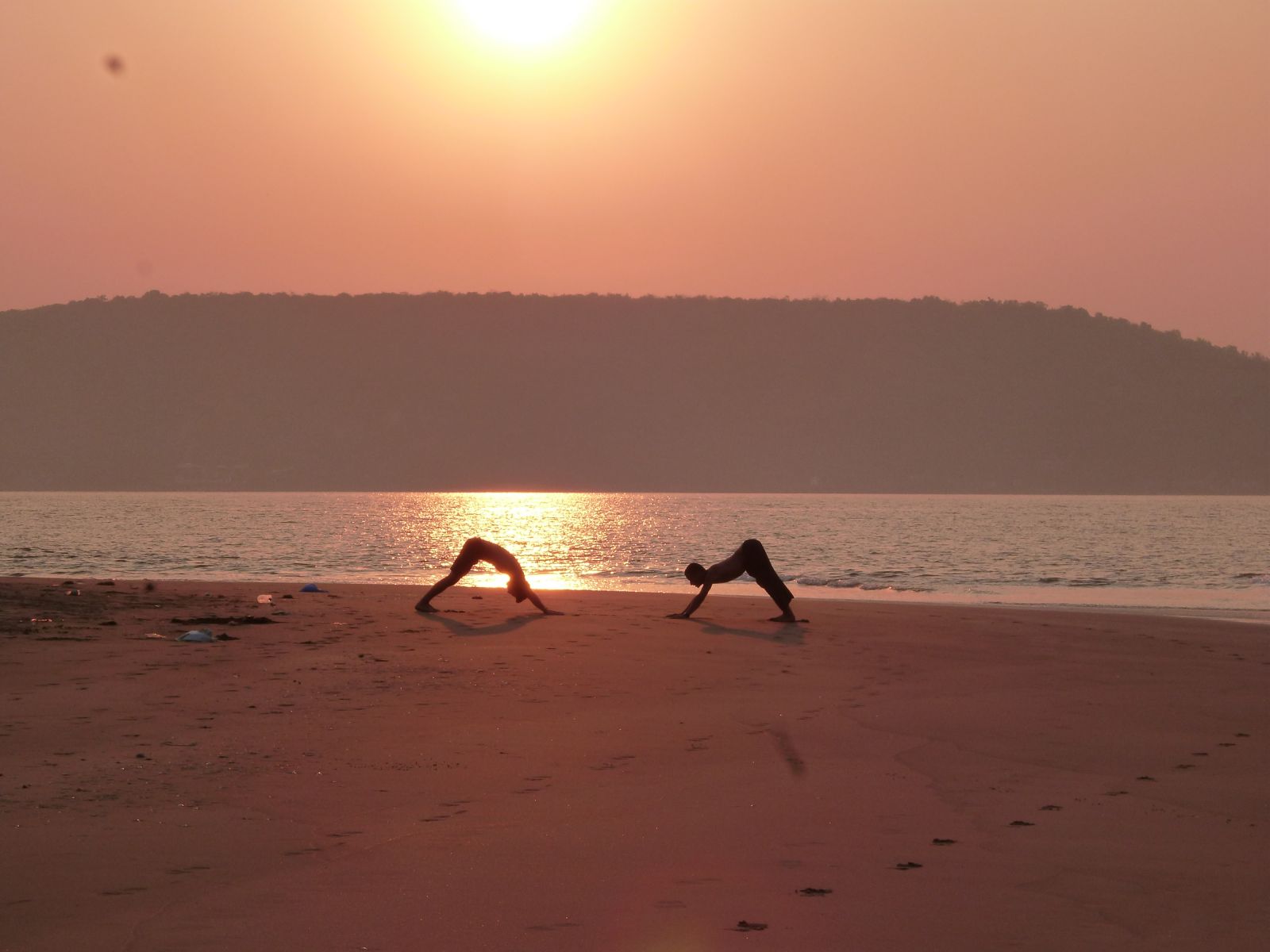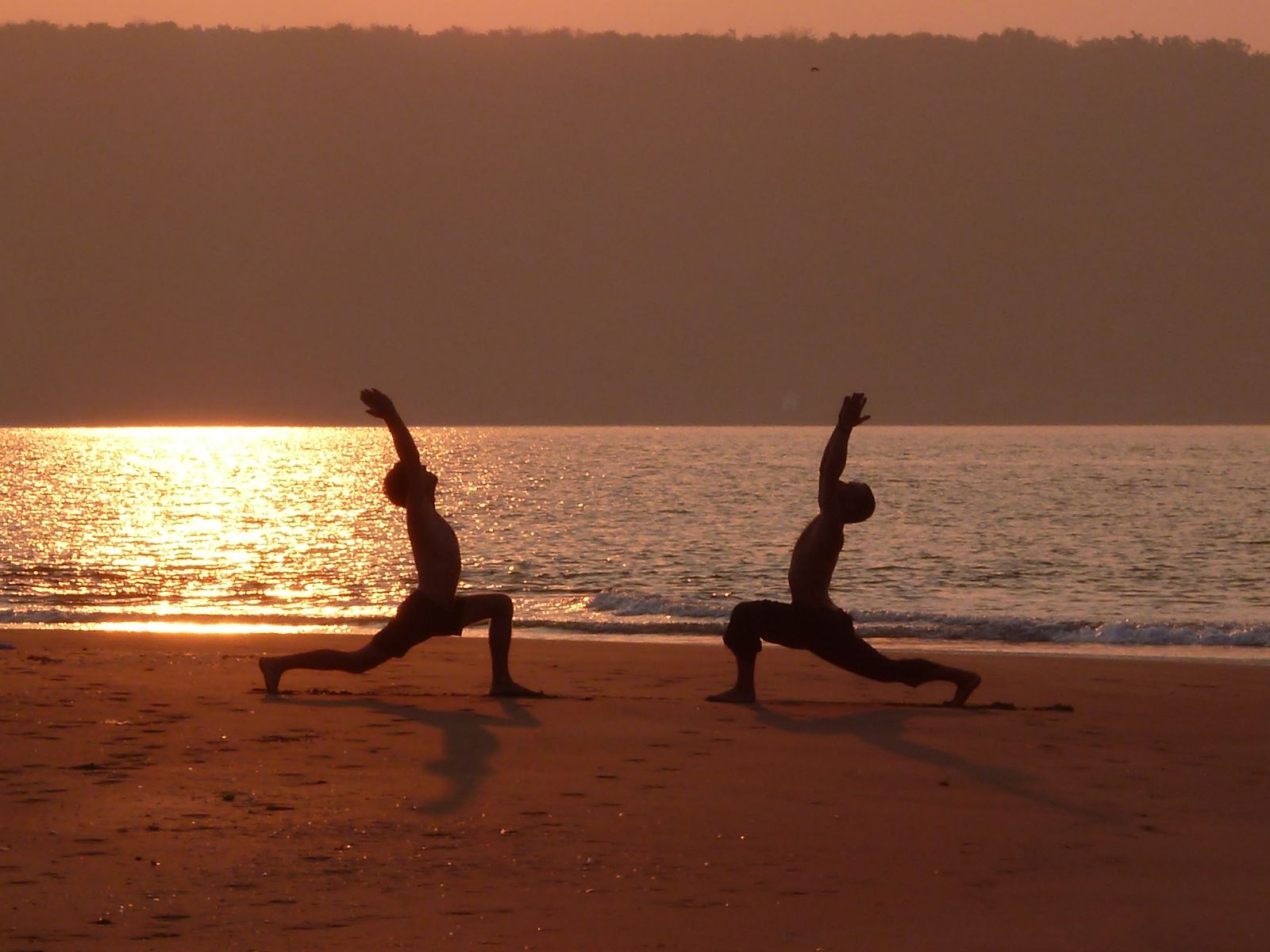 朝日の中、浜辺でスーリヤ・ナマスカールをする西洋人の若者たち。
