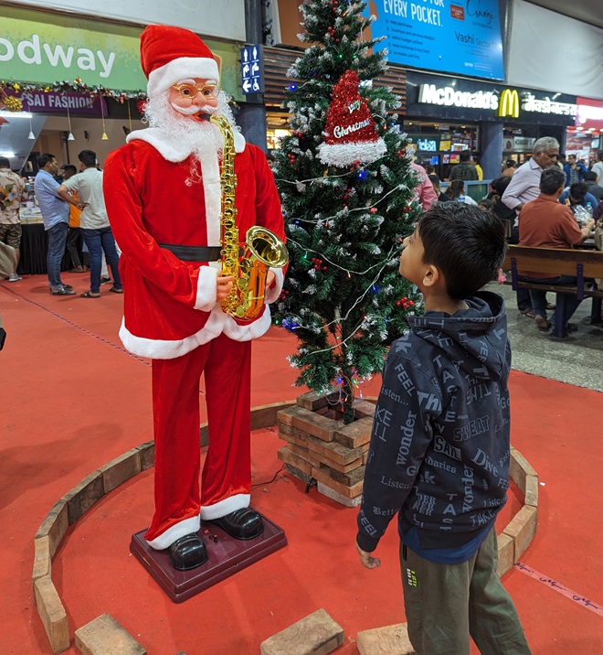 確かに昨晩は、ムンバイー国際空港からプネーまで6時間近くかかってしまいました。写真は途中立ち寄ったサービスエリア風フードコートで見かけたシュールなサンタです。