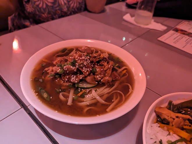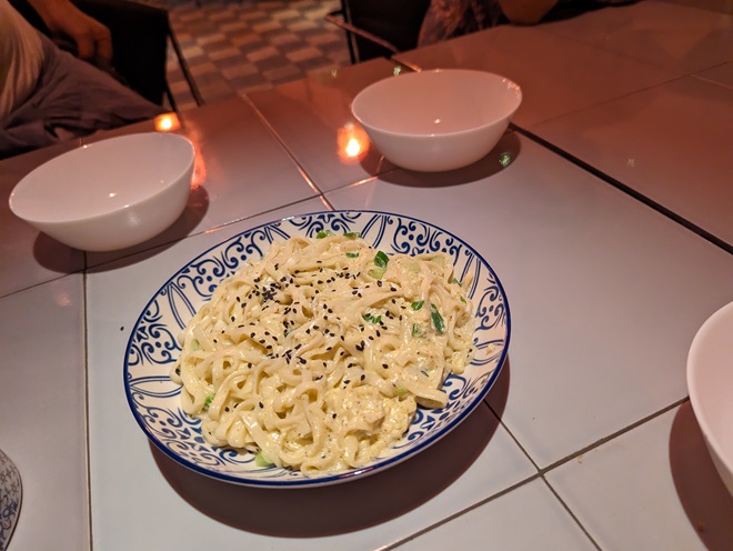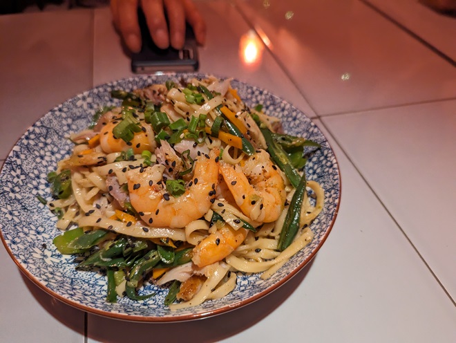 驚いたのは焼きそば風ヌードルで、大ぶりのエビと焼き魚のフレークを具にたっぷりと使い、ゴマ油が香ばしい逸品。