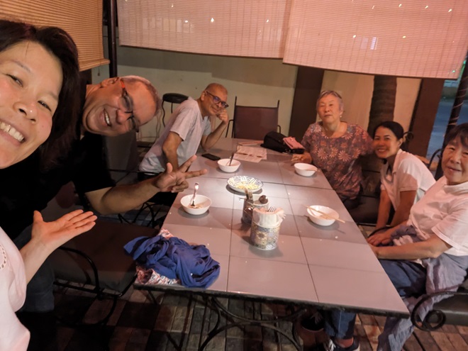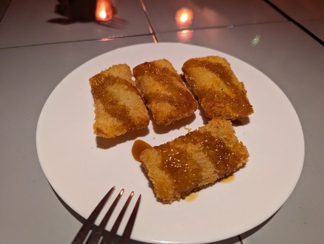 この日、気さくでご親切な、バリトンの美声を持つ大将と、従業員のフィリピン人マリアさんとの会話が弾み、試作品の「うどんカルボナーラ」と、マリアさん自慢のフィリピン風アップルパイ(パンの切れ端にアップルフィリングを包み、油で揚げたフィリピンのお菓子)をサービスしてくださった。