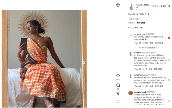 その @natasha.thasan さんのアカウントでひときわわたしの目を引いたサリーが、上の画像左端にあるオレンジ色のものだ。
