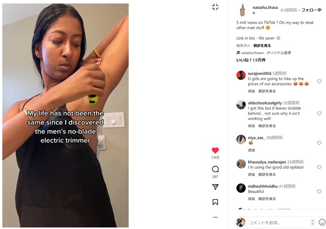 ちなみに @natasha.thasan さんには、ワキ毛処理のゲームチェンジャーとして、Phillipsの男性用電動シェーバーも教えてもらい、おかげでワキつるつるの快適生活を送っている。