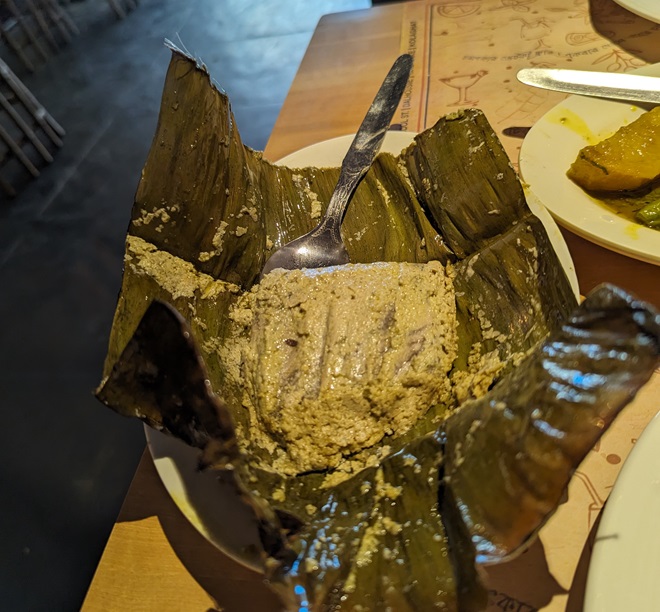 特に食べたかったのは、マスタードペーストに漬け込んだ魚をバナナリーフに包んで蒸し焼きにした「Bhetki Paturi」だ。