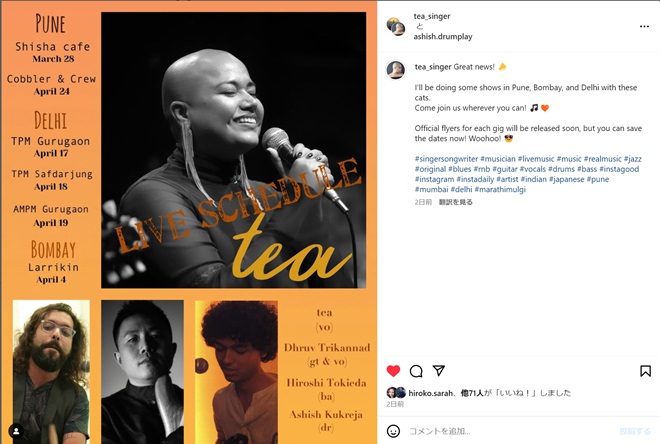 4月4日はムンバイー(ジュフー)、17日から19日にはデリーで、ライブを開催される予定です。