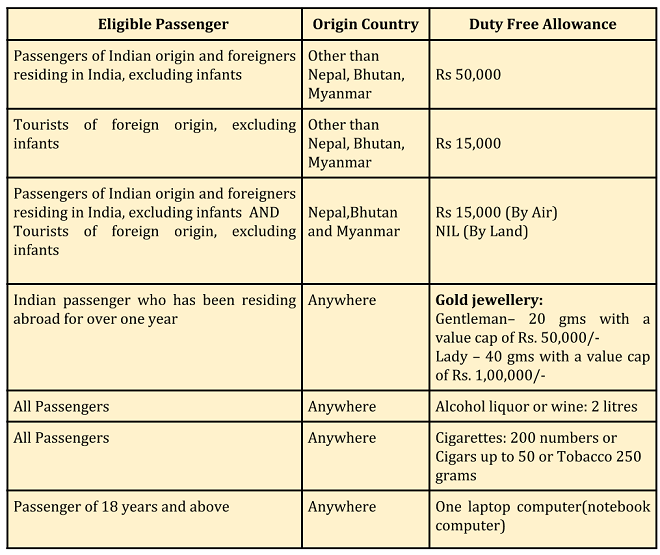 外国人も含めたインド居住者、およびネパール、ブータン、そしてミャンマー以外の国からインドに到着したインド系観光客は、最大5万ルピーまでの使用品、手土産、その他禁止品以外の物品を免税で持ち込める。