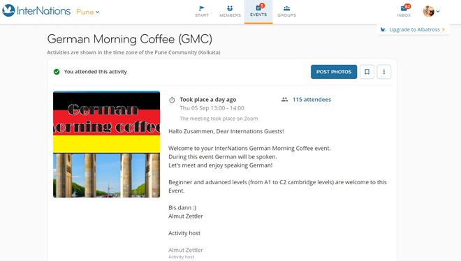 このようにして、ソニアさんのおかげで大いにドイツ語学習を楽しむ中、やはりプネーで「コーヒーミートアップ」などでお世話になっている、ドイツに本部を置く国際交流団体「InterNations」がオンラインで主催する「German Morning Coffee」に先日、参加してみた。