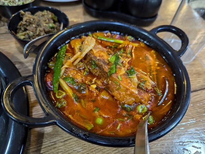 どちらも激辛同士のぶつかり合いで、しかも魚は小骨が非常に多く、苦労しつつもあっという間に完食。