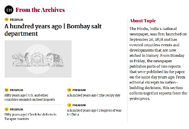 「The Hindu」を有料購読しているので、プレミアム版で100年前と50年前の記事も楽しむことができる。