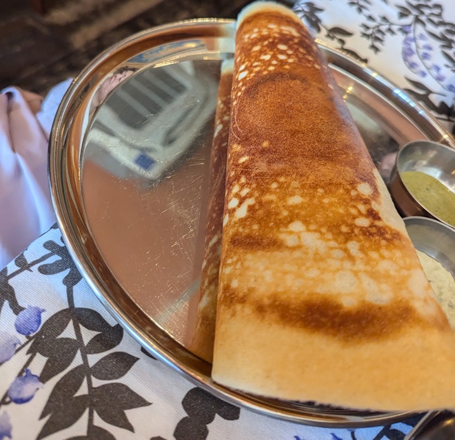 We ordered two Nononeco thali and a plate of half-sized masala dosa, and then the man in the kitchen prepared a phulka for each of us.