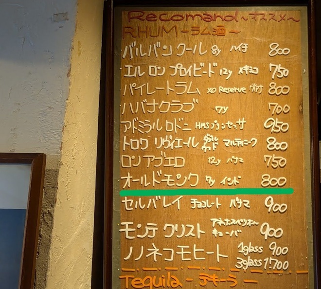 Old Monk, 800 yen per glass.