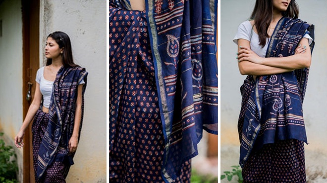 Kaisori Malhar - Dabu Pharad Makkhi handblockprinted Silk Cotton saree