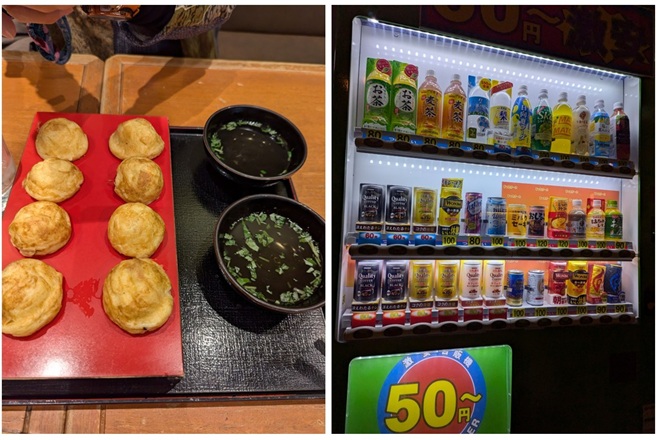Akashi-yaki, the appe-like dumplings, and the vending machine for 50-yen beverages.