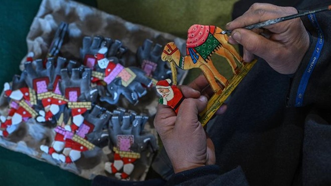 こちらは、ジャンムー・カシミール地方シュリナガル(Srinagar)で、ツリーのオーナメントを製作する張り子職人の手元を写した1枚。