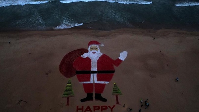 ベンガル湾のプリーでは、砂のアーティストとして名高いスダルシャン・パトナイク(Sudarshan Pattnaik)氏が、新たな世界記録を樹立する550キロものチョコレートを背負った全長160フィートのサンタクロースを描いた。