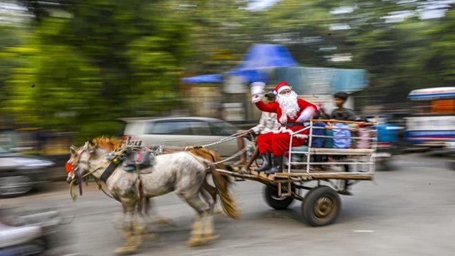 ムンバイーでは、サンタクロースの格好をした男性が馬車で公道を走る。