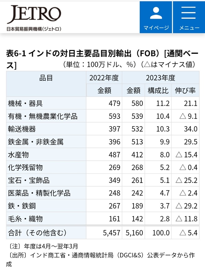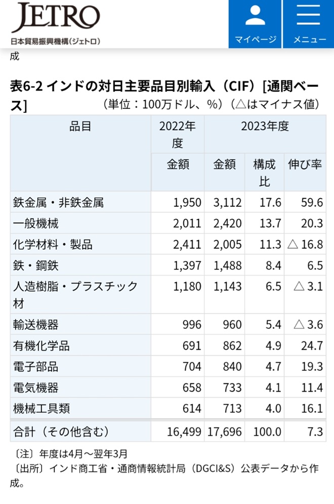 なお、JETRO発表の資料によると、2023年の日本とインド間の機械・設備貿易については、日本からインドへの輸出(一般機械と機械工具類)が前年比19%増の26億2,500万ドル、インドから日本への輸出(機械・器具)が11%増の5.8億ドルとなった(出典: JETRO)。