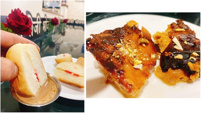 Beautiful caramel custard (right) and homemade tutti-frutti sandwitched bun maska,