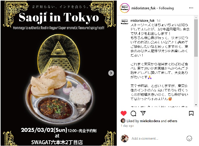 Now, Takashi-san is going to open "One-day Saoji" at Swagat Roppongi 2-chome.
